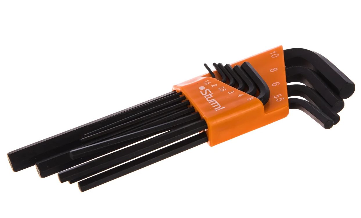 Набор шестигранных ключей Cr-V 10шт. 1,5-10мм Sturm 1045-04-10x10 обеспечивает работу с типовыми размерами.Угловая форма и две рабочих головки позволяют вращать заглубленный или тугой винт без особых усилий. Комплект поставляется в удобном держателе.