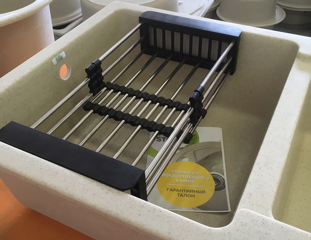 Универсальный коландер с телескопическими выдвижными направляющими из нержавеющей стали – популярный аксессуар в продуктовой линейке каменных моек Ecology Stone, предназначенный для разморозки продуктов и мытья овощей и фруктов.