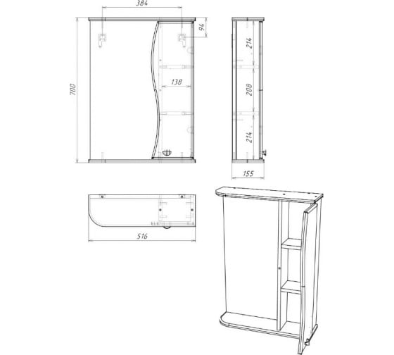 Шкаф – зеркало волна 2-50, 2-55, 2-60 в левом и правом исполнении, имеет по бокам полки.