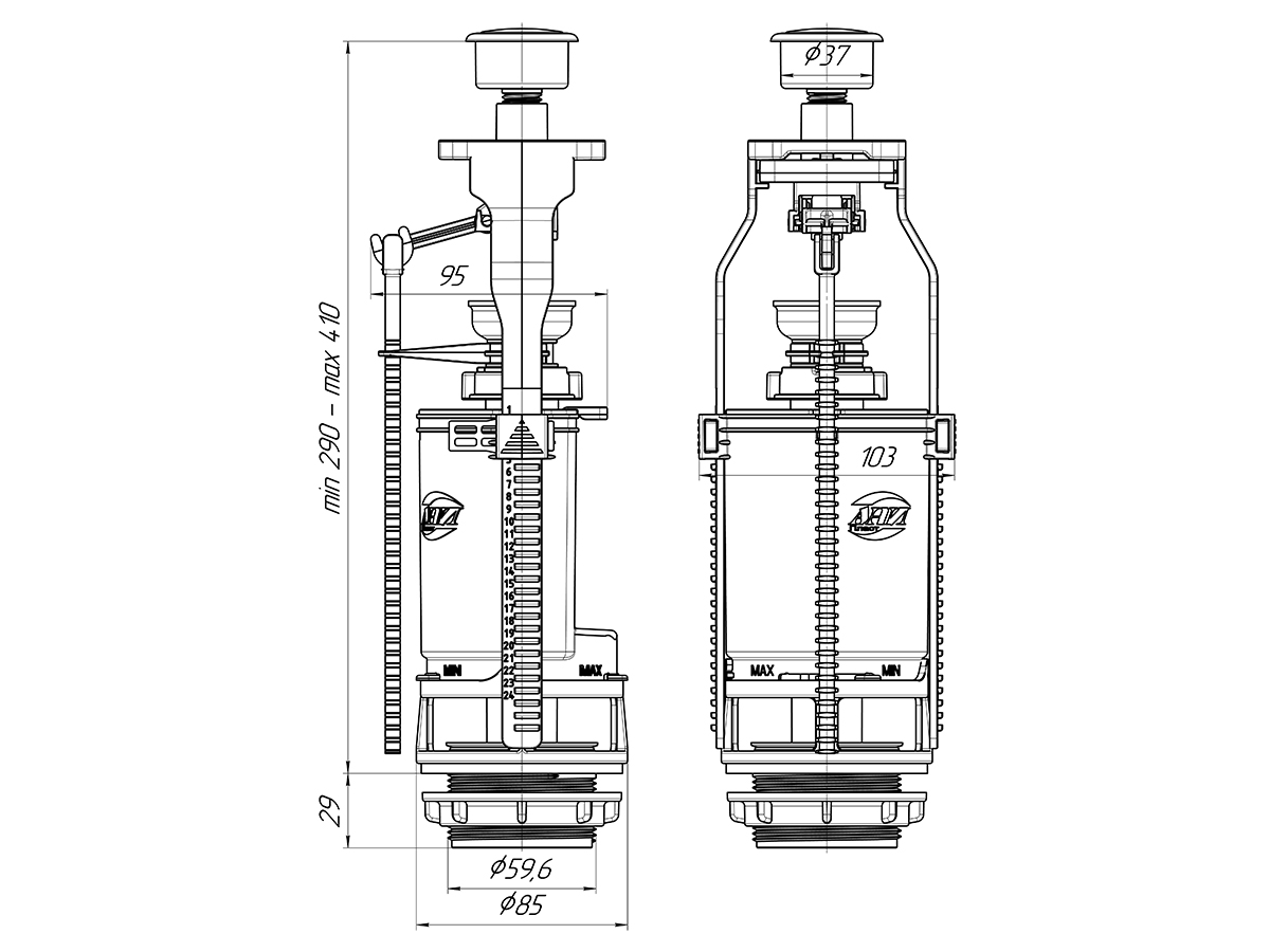 - Регулировка высоты в диапазоне 290-410 мм позволяет адаптировать механизм под разные модели бачков.