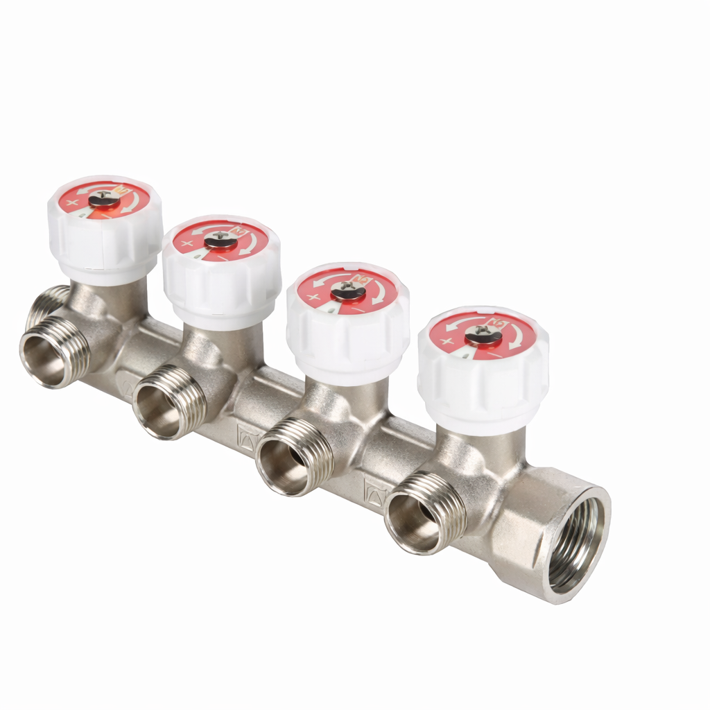 Коллектор с регулировочными вентилями 4 вых. 1 х 3/4 ЕвроконусЛатунный никелированный коллектор предназначен для распределения теплоносителя и воды в системах отопления и водоснабжения. Оснащён выходами 3/4" стандарта «евроконус» (наружная резьба) и индивидуальными регулирующими вентилями на каждом отводе, что позволяет точно настраивать расход по каждому контуру.