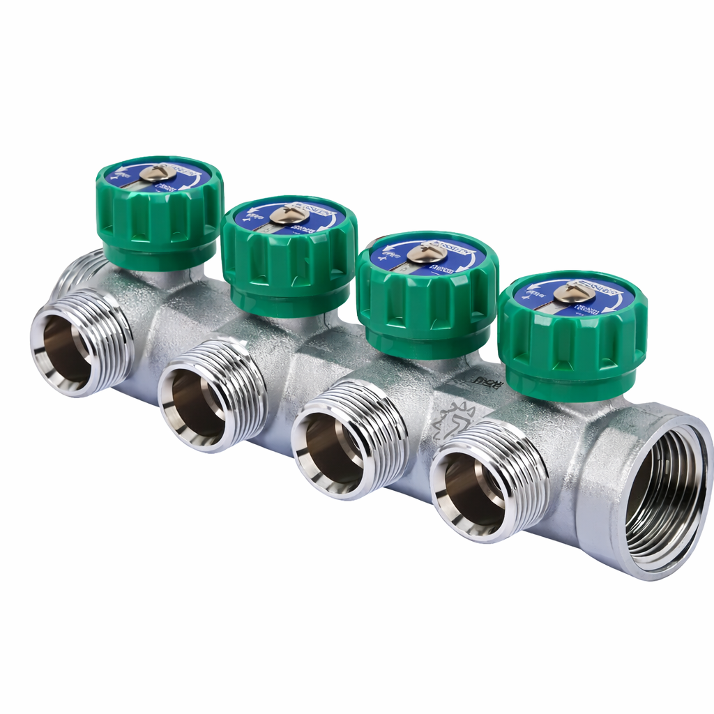 Корпус изготовлен из прочной латуни с никелированным покрытием, устойчивым к коррозии и перепадам давления. Регулирование осуществляется вентильным механизмом, позволяющим точно настраивать расход воды по каждому контуру.