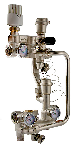 Другие основные элементы узла: байпас с перепускным клапаном; встроенные шаровые краны для отключения циркуляционного насоса; автоматический воздухоотводчик; погружной термометр.