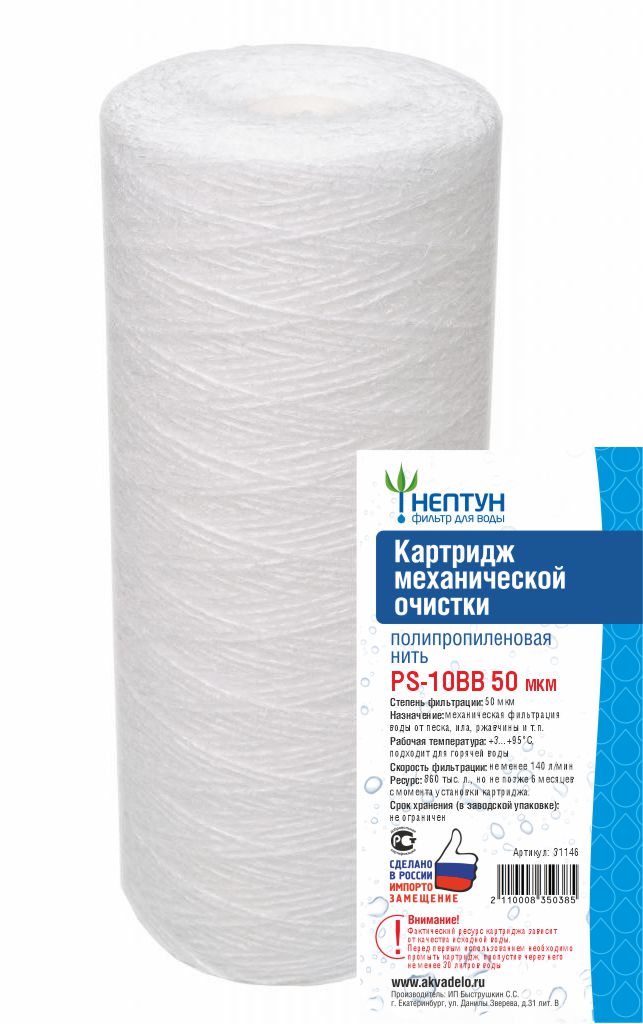 Картридж BB10 PS-50 мкм, полипропиленовая нить НептунВы хотите пить и использовать чистую воду без загрязнений и неприятных привкусов? Тогда вам нужен сменный полипропиленовый картридж — надежный и эффективный элемент системы очистки воды. Он способен удалять из воды механические примеси размером до 50 микрон, обеспечивая вам высокое качество воды для здоровья и комфорта.
