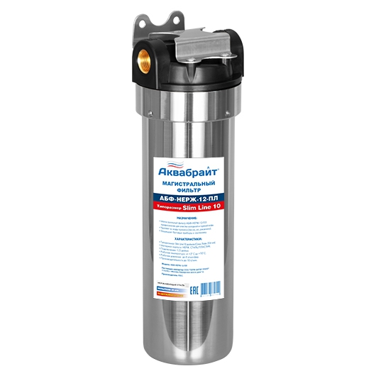 Магистральный фильтр АКВАБРАЙТ серии АБФ-НЕРЖ модель АБФ-НЕРЖ-12-ПЛ изготовлен из НЕРЖАВЕЮЩЕЙ СТАЛИ и пластика.Назначение: