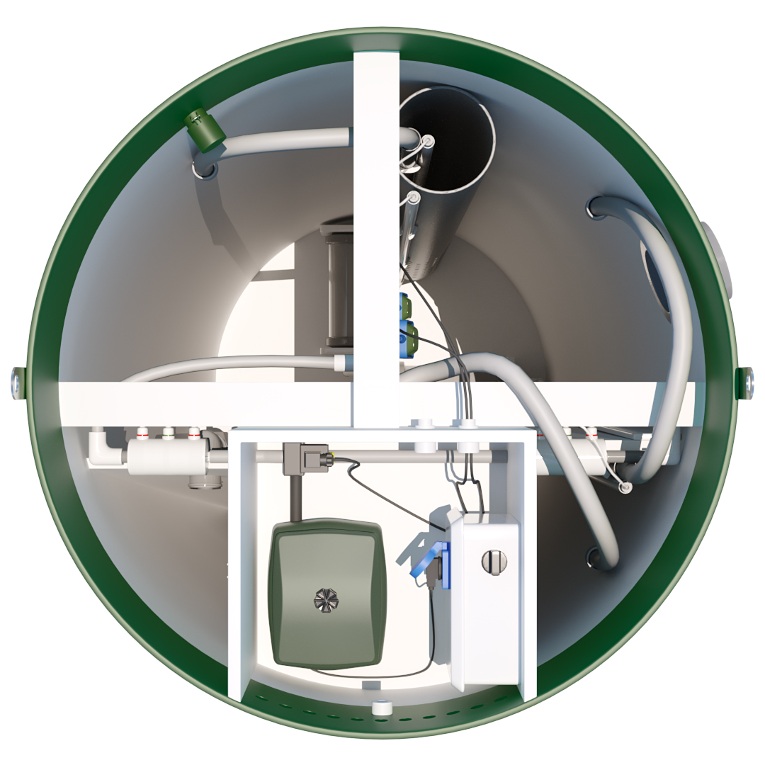 Станция стабильно работает при высоком уровне грунтовых вод и в любых типах грунта. При необходимости возможна установка насоса для принудительного отвода очищенных стоков. Конструкция обеспечивает тихую работу и не требует частой откачки.