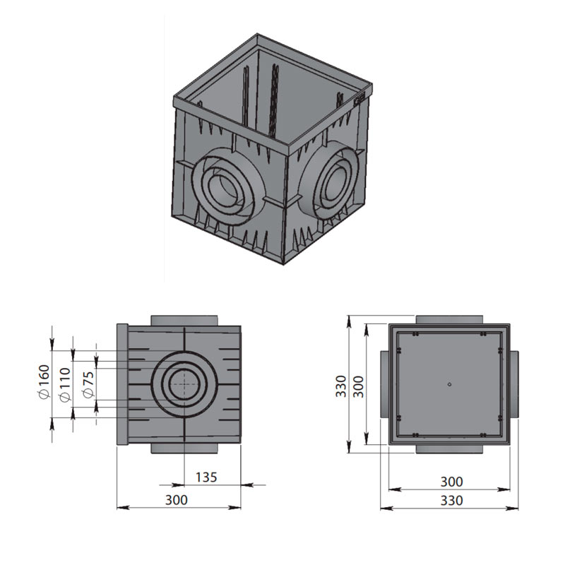 Предназначен для сбора воды с кровельных водостоков.На всех торцевых стенках пластиковых дождеприемников 300х300 предусмотрены соединения с трубой ?75, ?110, ?160 мм.