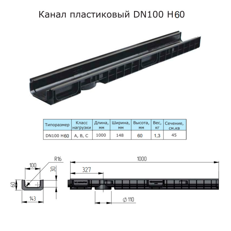 Лоток водоотводный пластиковый КВ 145 ш х 60 в х 1000 д. DN100 GidroGroup