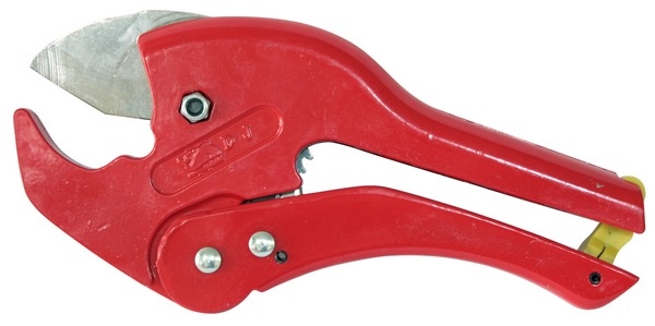 Ножницы для труб диаметром до 40 мм(VTm.394.0) Ножницы с рычажным механизмом открывания. Обеспечивают разрезание под прямым углом пластиковых и металлопластиковых (металлополимерных) труб диаметром до 40 мм. Конструкция инструмента включает нож из нержавеющей стали, храповой механизм, защелку, фиксирующую ножницы в закрытом положении, рычаги открывания. Нож поднимается при разведении рукояток до упора.