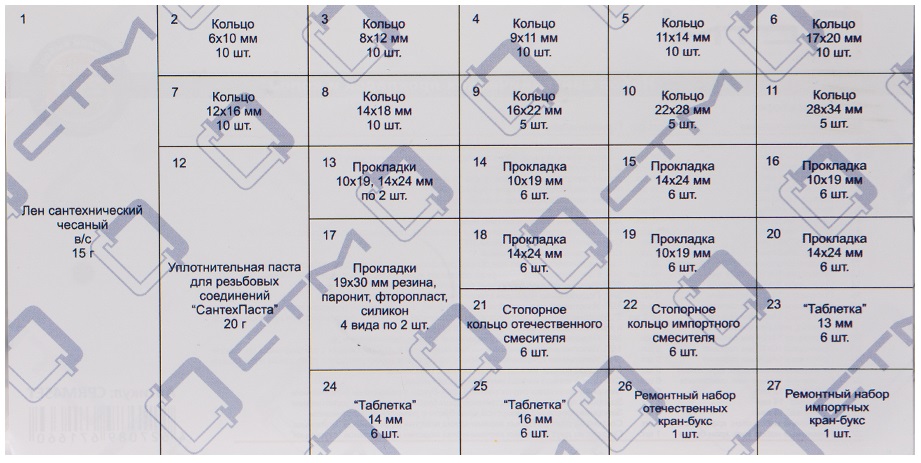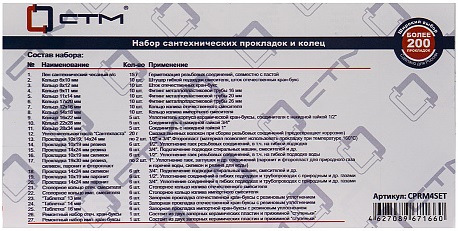 Набор сантехнических прокладок для смесителя "Сантехник" №4 в боксе СТМ предназначен для ремонта и уплотнения различных соединений:1.Кольцо 6х10мм - 10шт.