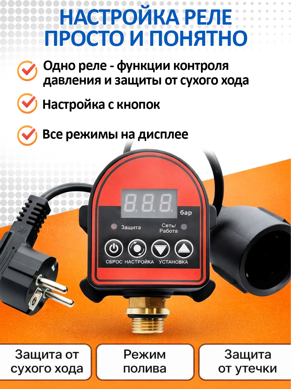 Электронное реле давления автоматически включает и отключает насос, отличается высокой точностью и простой настройкой. Встроенная защита от сухого хода и утечек предотвращает работу насоса без воды и продлевает срок службы оборудования.