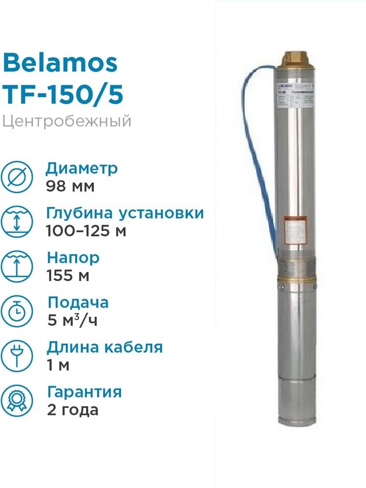 Насос скважинный погружной центробежный TF -150 (4", 220В, 2500Вт, 5000л/ч, 155м) кабель 1 м. BELAMOS