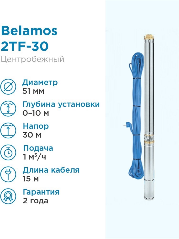 Насос скважинный погружной центробежный 2TF-30/1(515Вт.,1000л/ч ,30м.) кабель 15м. BELAMOS