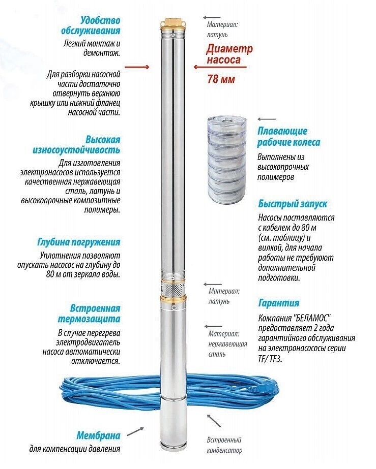 ?? Скважинный погружной насос Belamos TF3-60 разработан для высокоэффективной подачи чистой воды с большой глубины в жилищные объекты и для орошения сада. Устанавливается прямо в пробуренные скважины и применяется в автоматических системах водоснабжения дач, частных домов, коттеджей и других построек, не имеющих возможности подключения к центральной системе водоснабжения.?? Преимущества: