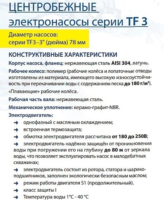 Насос скважинный погружной центробежный TF3 -60 (3", 220В, 800Вт, 2700л/ч, 60м) кабель 1,5 м. BELAMOS
