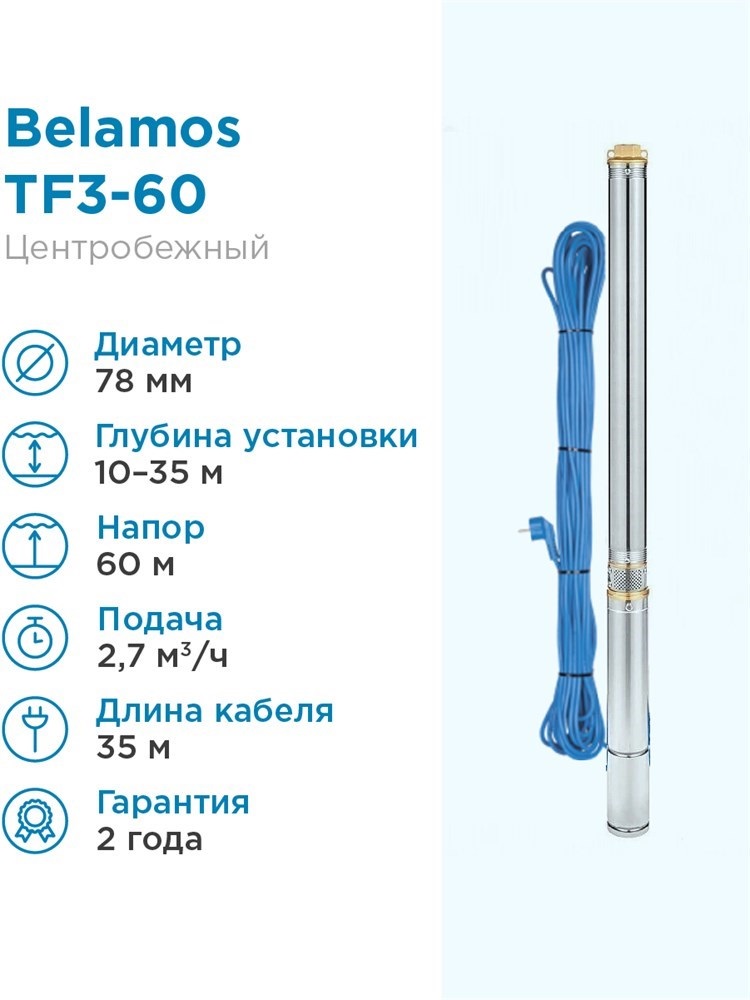 Насос скважинный погружной центробежный TF3 -60 (3", 220В, 800Вт, 2700л/ч, 60м) кабель 35 м. BELAMOS