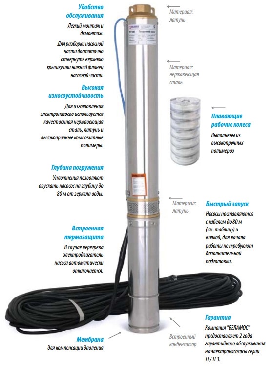 ?? Скважинный погружной насос Belamos TF3-60 разработан для высокоэффективной подачи чистой воды с большой глубины в жилищные объекты и для орошения сада. Устанавливается прямо в пробуренные скважины и применяется в автоматических системах водоснабжения дач, частных домов, коттеджей и других построек, не имеющих возможности подключения к центральной системе водоснабжения.?? Преимущества: