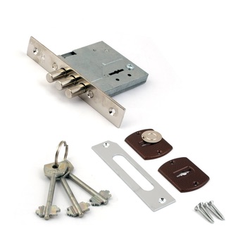 Замок врезной 6-сувальдный. Предназначен для установки в металлические и деревянные двери толщиной 40-50 мм и металлические шкафы. Замок универсальный, возможна установка как в правые, так и в левые двери. Комплектуется 3/5 стальными ключами. Замок открывается и закрывается изнутри и снаружи ключом. Выпускается в двух исполнениях: с прямоугольным засовом (ЗВ8-6/0) и с засовом из трех стержней круглого сечения (ЗВ8-6/1). Покрытие корпуса — цинковое. Покрытие лицевой планки — никелевое, ответной планки — цинковое. Замок имеет защиту от высверливания. Изготовлен из высокопрочных материалов. Имеет защитное покрытие.Механизм секрета 6-сувальдный 120000 секретов