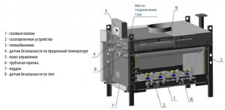 Легкий доступ к элементам газогорелочного устройства для обслуживания и ремонта. Имеется съемный поддон для удобства чистки топки.