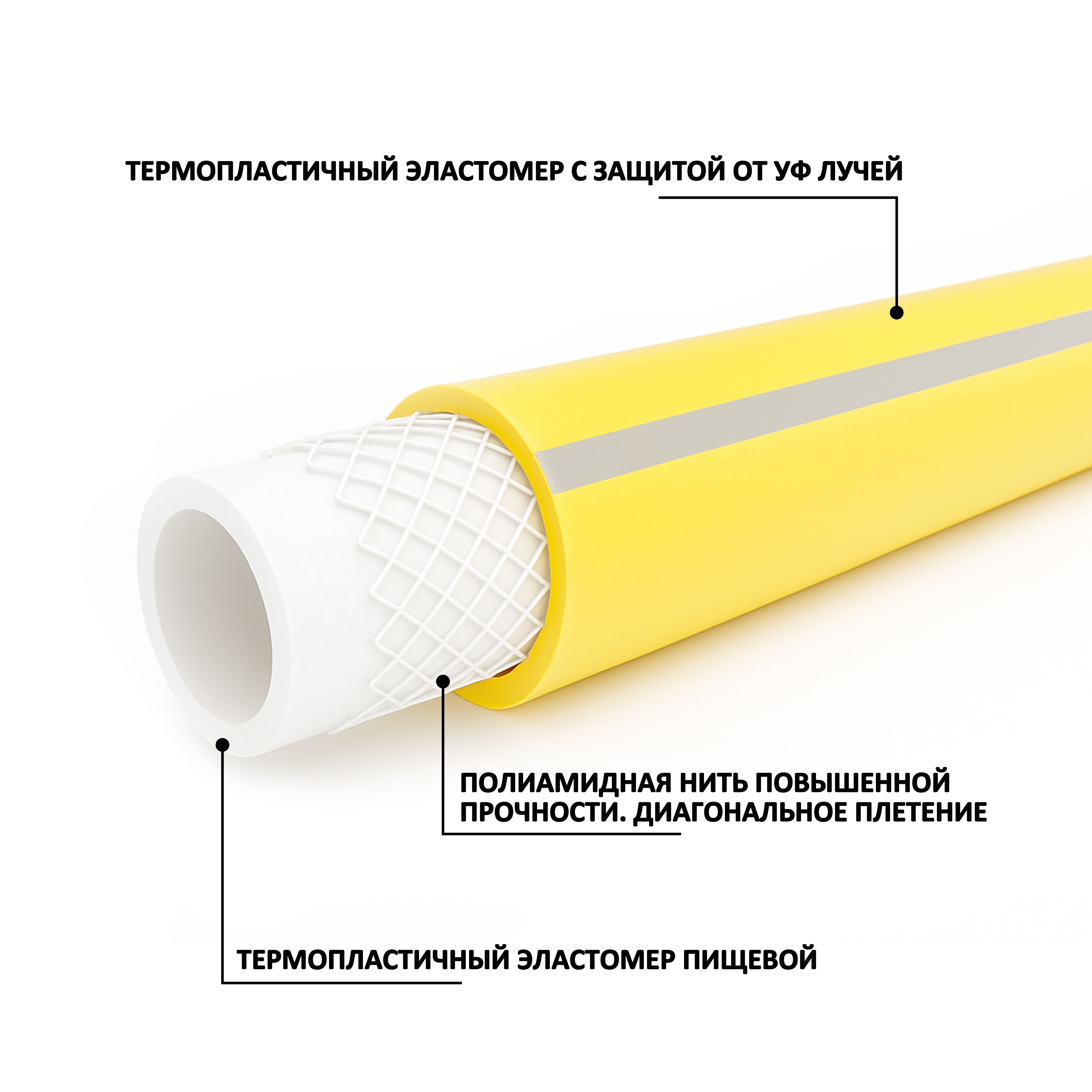 Структура и внешний вид: внутренний слой не прозрачный ,белый, армирующая нить, наружный слой не прозрачный черный, полоса красного цвета.Особенность: шланг обладает средней степенью мягкости и пластичности, благодаря этому шланг совсем не скручивается и не заламывается, а в случае скручивания или залома вернется в свой первоначальный вид. Шланг спокойно выдержит наезд легкового автомобиля. Применение: для перекачки и транспортировки жидкостей, в том числе пищевых, свидетельство СГР №KG 11 6109 019E.005626.09Q2.