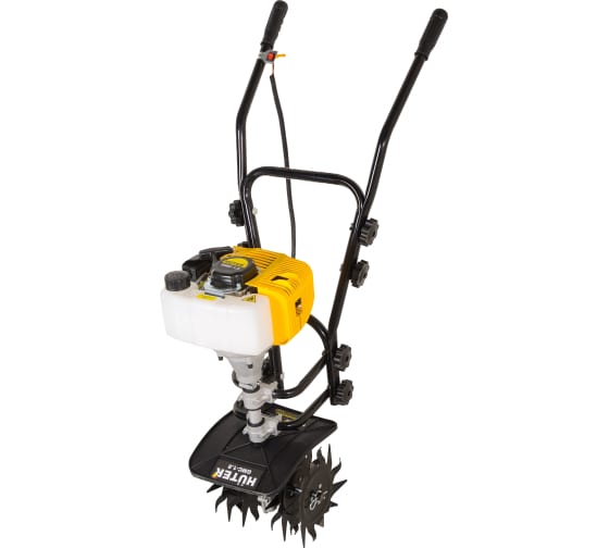 Мотокультиватор HUTER GMC-1.8– предназначен для рыхления легкого грунта, вспахивания грядок и прополки межрядного пространства на небольших садово-огородных участках, в теплицах. С его помощью подмешивают мульчу под культуры, вносят удобрения, выравнивают поверхность грядок.Мотоблок мощностью 1 л.с. с 2-х тактным двигателем работающем на бензине АИ92 и масле (40:1), вместимость бака 0,65 л. Для приготовления топливной смеси производитель рекомендует использовать фирменное полусинтетическое моторное масло для двухтактных двигателей «HUTER 2T» в соотношении бензин/масло 40:1. Хромированная поршневая группа обеспечивает надежную работу машины.