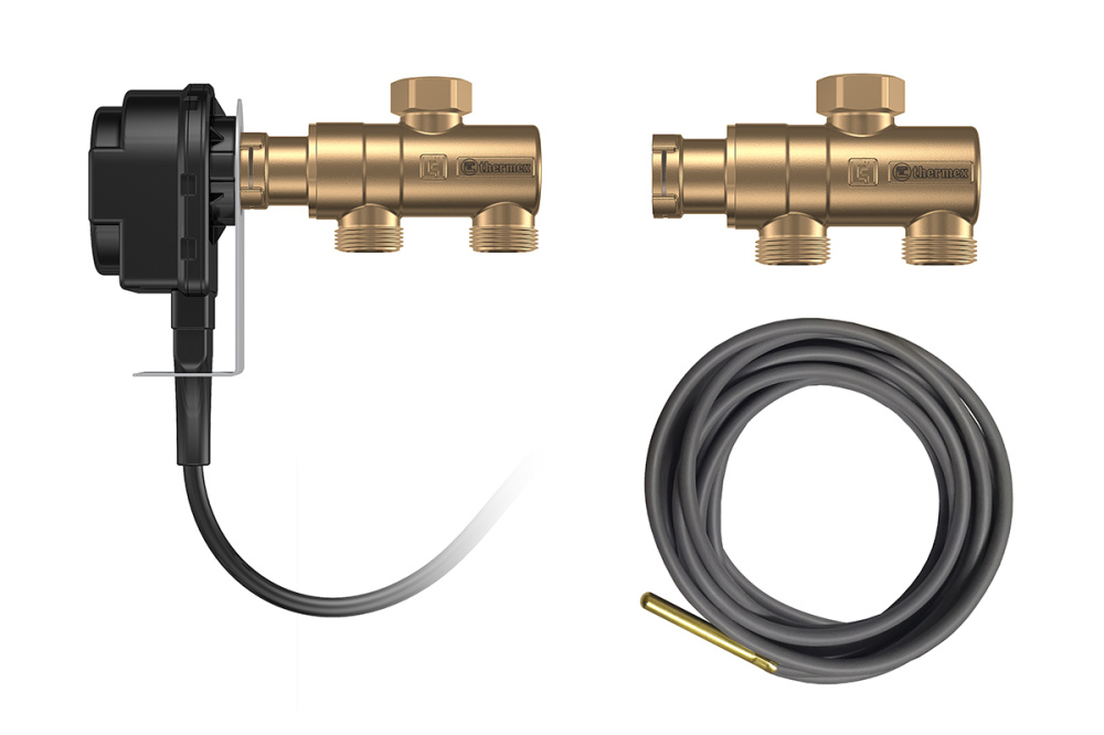 Комплект устройств. Thermex dLine состоит из трех основных частей - трехходовой клапан с сервоприводом, который обеспечивает переключение направление потока теплоносителя, гидравлический трехходовой клапан, который дублирует работу первого устройства на обратной линии, и датчик температуры для внутреннего бака водонагревателя, который контролирует уровень нагрева воды в системе ГВС.