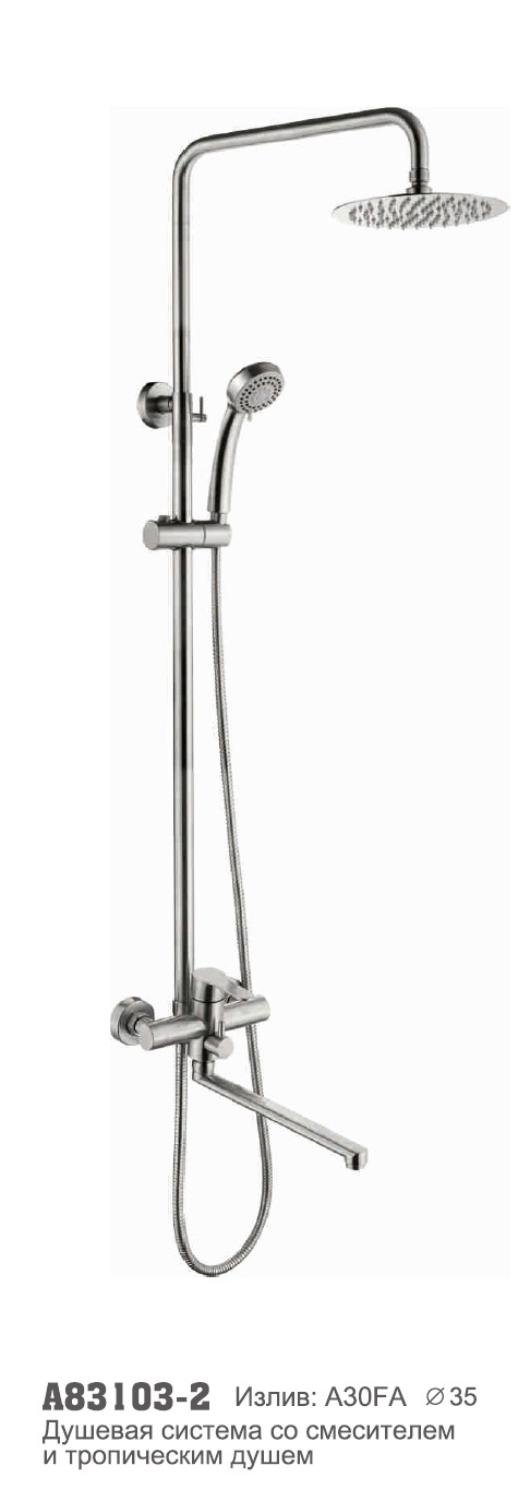 Душевая система со смесителем и тропическим душем Нержавеющая сталь Accoona A83103-2 это сочетание современного, оригинального дизайна, надежности и комфорта. Душевой гарнитур с тропическим душем имеет специальный рассеиватель- при прохождении через решетку тропического душа вода поступает плотными упругими струями и объединяется с воздухом, струи становятся мягче и уже не стучат по телу, а нежно окутывают его. Вы сможете расслабиться от суеты повседневной жизни под теплым тропическим ливнем. Душевая система с изливом и тропическим душем очень практичное решение, вы без труда сможете набрать воды в емкость, постирать и так далее.Душевая система из нержавеющей стали надежная и выгодная покупка она легко переносит резкие перепады температуры и устойчива к поверхностным повреждениям. Для поддержания идеального внешнего вида ее достаточно протереть махровой тряпочкой.