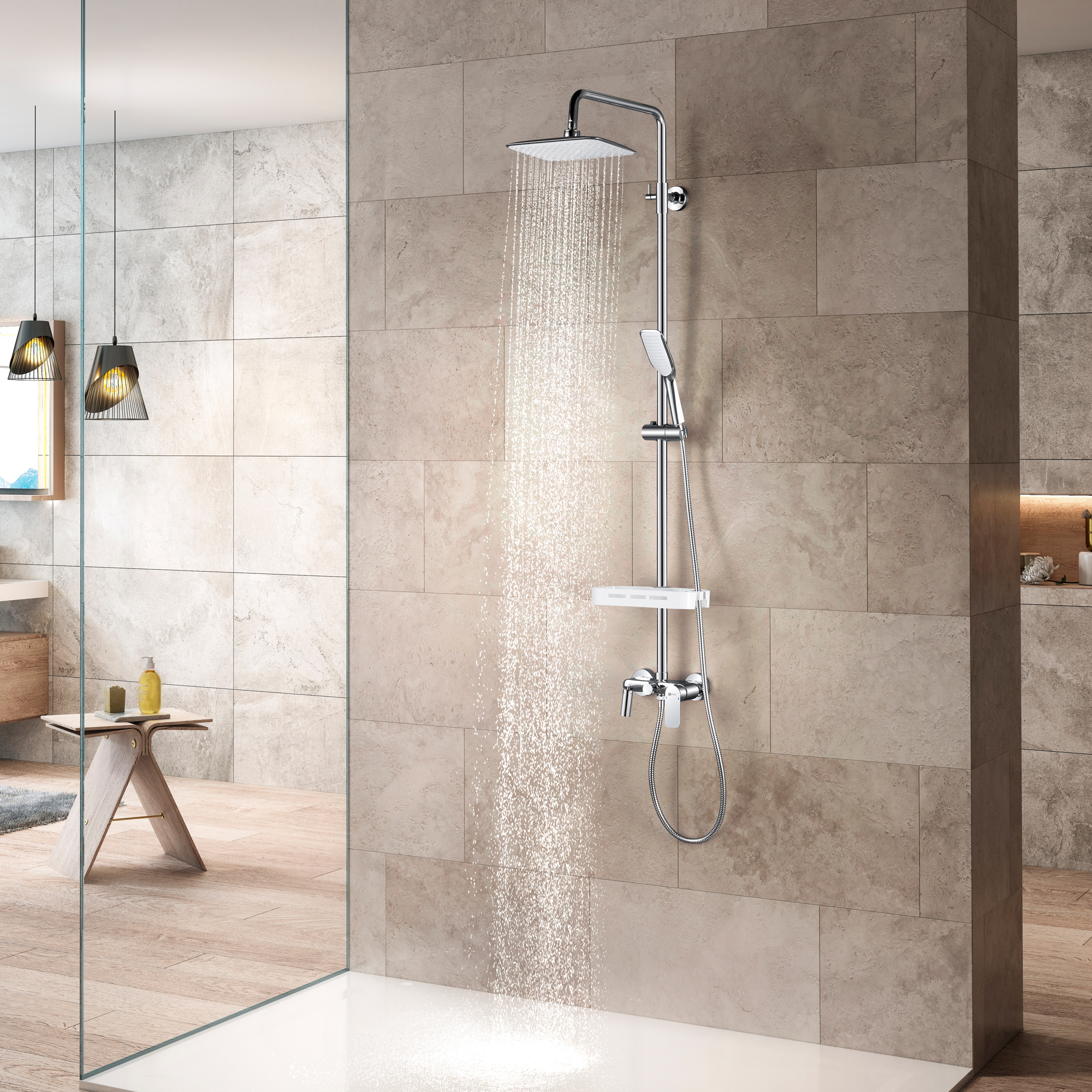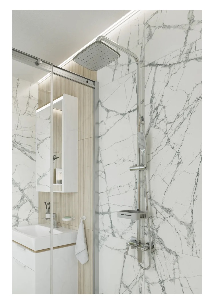• Полочка для душевых принадлежностей позволяет комфортно размещать различные душевые принадлежности, поддерживая порядок и удобство при использовании системы.