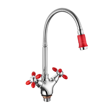 Смеситель кухня на гайке крест гибкий излив Силумин Красный+Хром Accoona A4882N (АС5)