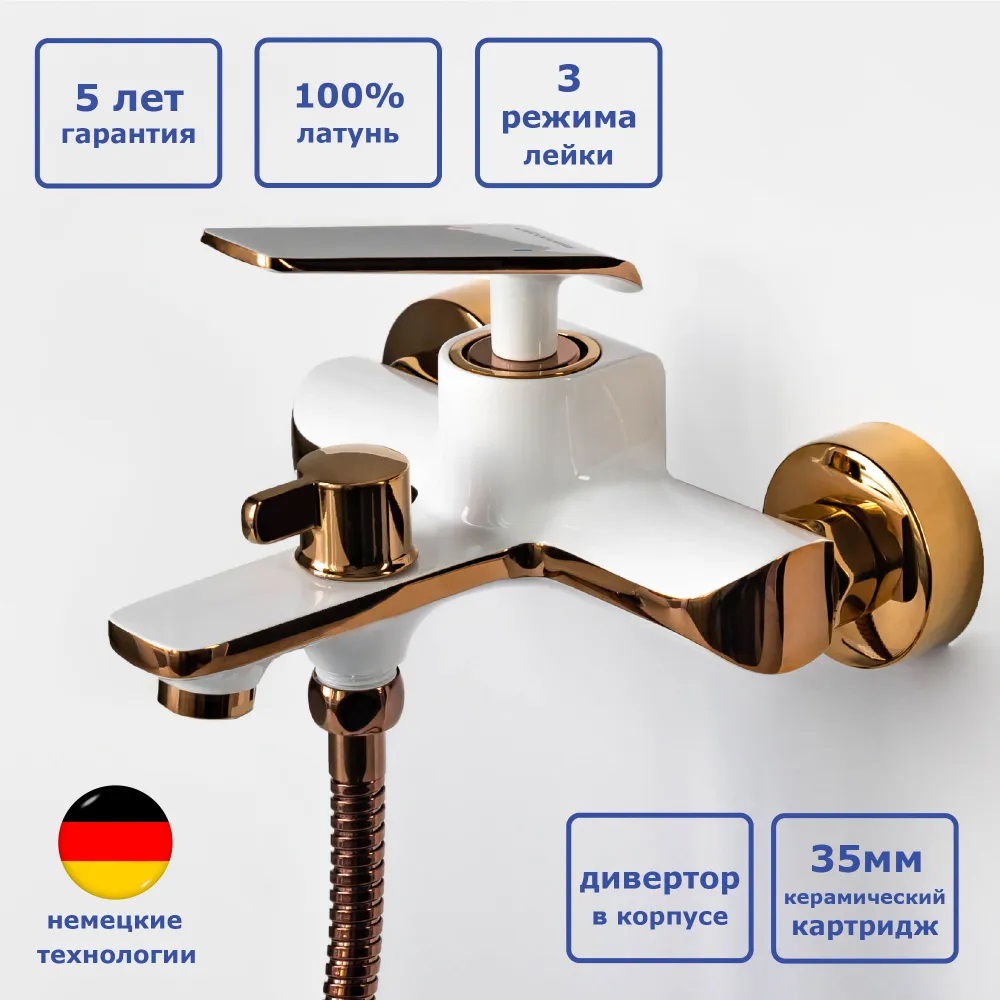 Смеситель для ванны с душем и монолитным изливом Ассооnа А63123GR в цвете белый + розовое золото придает в себе современный, лаконичный оригинальный дизайн и комфортное пользование.