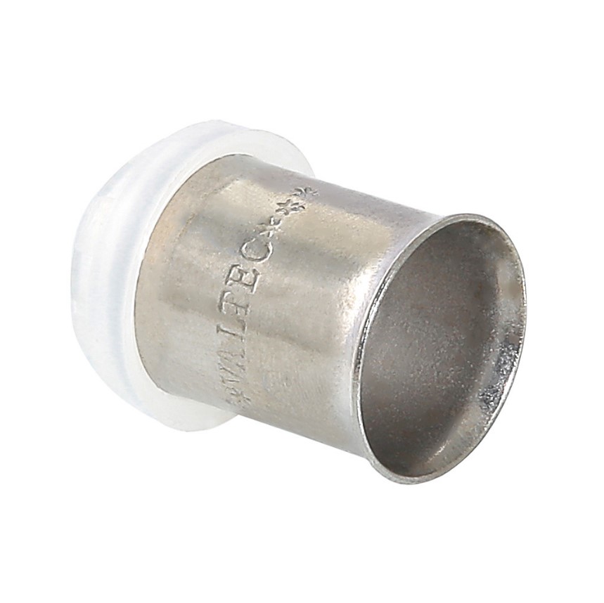 Гильза для пресс-фитинга(VTm.290.N) Гильза с обоймой-фиксатором для пресс-фитинга VALTEC. Материал гильзы – пластичная нержавеющая сталь марки AISI 304, обоймы-фиксатора – нейлон PA 6. Гильза имеет монтажный раструб. Конструкция фиксатора обеспечивает правильное расположение пресс-насадки инструмента на соединителе, контроль полноты одевания металлополимерной трубы на штуцер, отсутствие электрического контакта алюминиевой прослойки трубы и латунного корпуса фитинга. Усилие обжатия гильзы – не более 1200 Н.