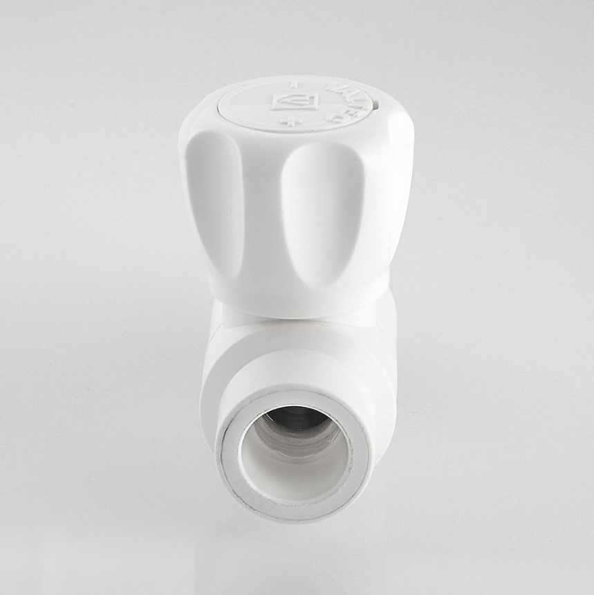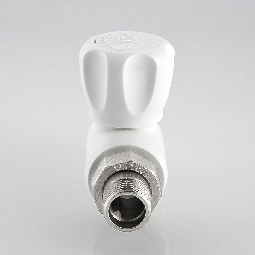 Кран шаровой радиаторный, полипропиленовый, прямой(VTp.718.0) Шаровой кран с полипропиленовым корпусом. Применяется для подключения радиаторов к разводке из полипропиленовых труб. Позволяет перекрывать поток теплоносителя через отопительный прибор. Подключение крана к радиатору производится с помощью латунного никелированного полусгона, закрепленного на закладной детали накидной гайкой. Соединение с трубой – раструбной сваркой. Шаровой затвор и шток крана выполнены из латуни, затвор хромирован. Кран неремонтопригоден. Наработка на отказ – 5 тыс. циклов. Расчетный срок службы – 15 лет. Рабочая температура теплоносителя – до 90 °С, рабочее давление – до 10 бар.