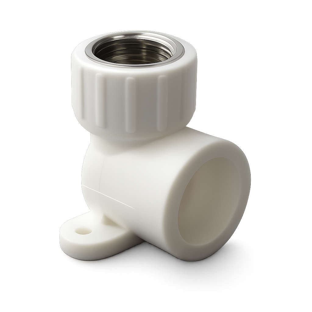 Угольник с наружной резьбой и креплением используется для соединения под углом 90оИ одновременного крепления к вертикальной плоскости трубы PPR с резьбовым фитингом с наружней резьбой.